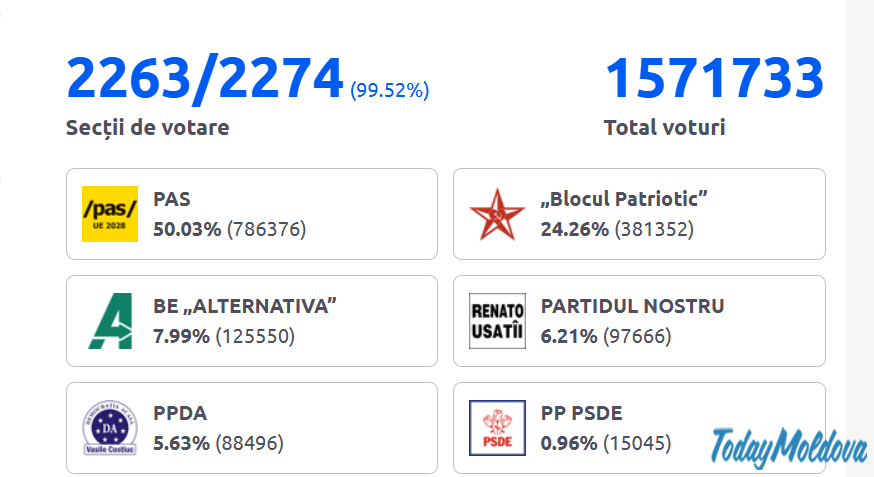 Предварительные данные представлены после обработки 2 251 протокола из 2 274. Ожидаются также результаты голосования граждан Молдовы из США и Канады.