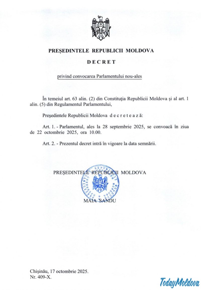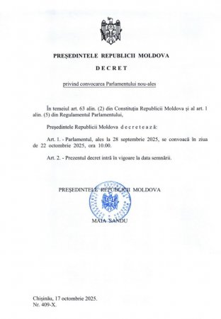 Президент Республики Молдова, Майя Санду, сегодня подписала указ о созыве парламента Республики Молдова XII созыва. Согласно президентскому указу, первое заседание нового законодательного органа состоится в среду, 22 октября, начиная с 10:00. На этом заседании депутаты должны выбрать руководящие и рабочие органы парламента, а также инициировать процедуры по утверждению нового правительства.