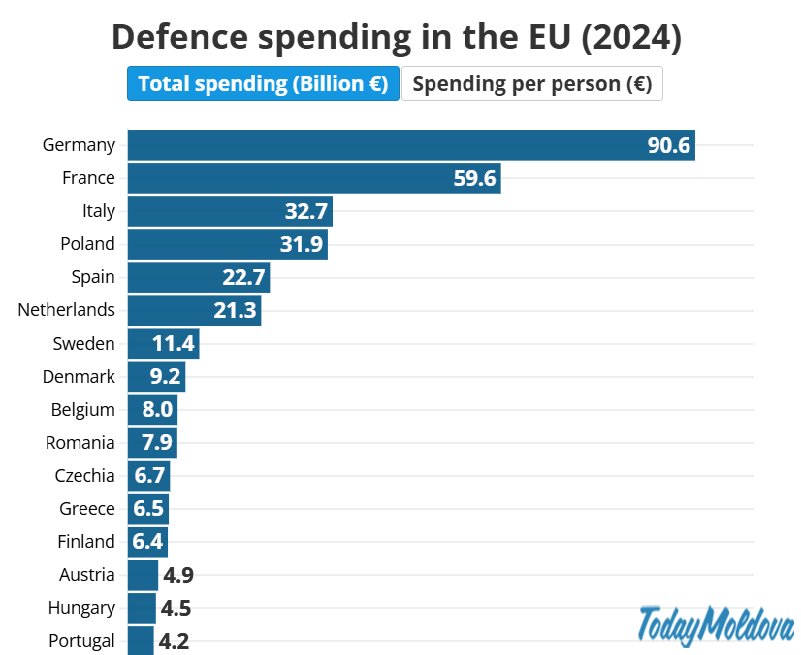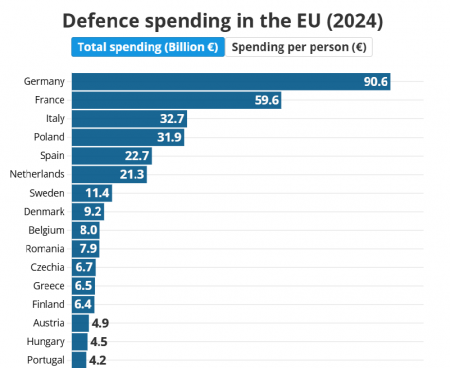 Согласно данным EDA, в 2024 году Германия направила на оборону 90,6 млрд евро — это 26,4% общих военных расходов ЕС. Франция занимает второе место с 59,6 млрд евро (17,4%). Вместе две крупнейшие экономики Европы обеспечивают 43,8% всего оборонного бюджета Евросоюза.