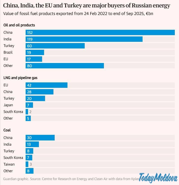 По трубопроводным поставкам ЕС получает около 35%, Китай — 30%, Турция — 29%.
