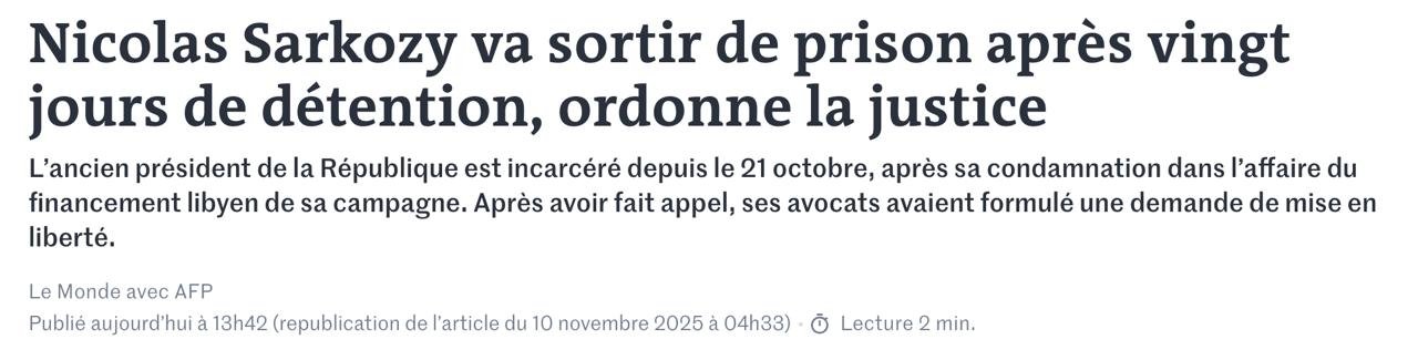 Суд Франции выпустил на свободу экс-президента Николя Саркози, который провел в тюрьме 3 недели из 5 лет по делу о финансировании предвыборной компании, сообщает Le Monde.